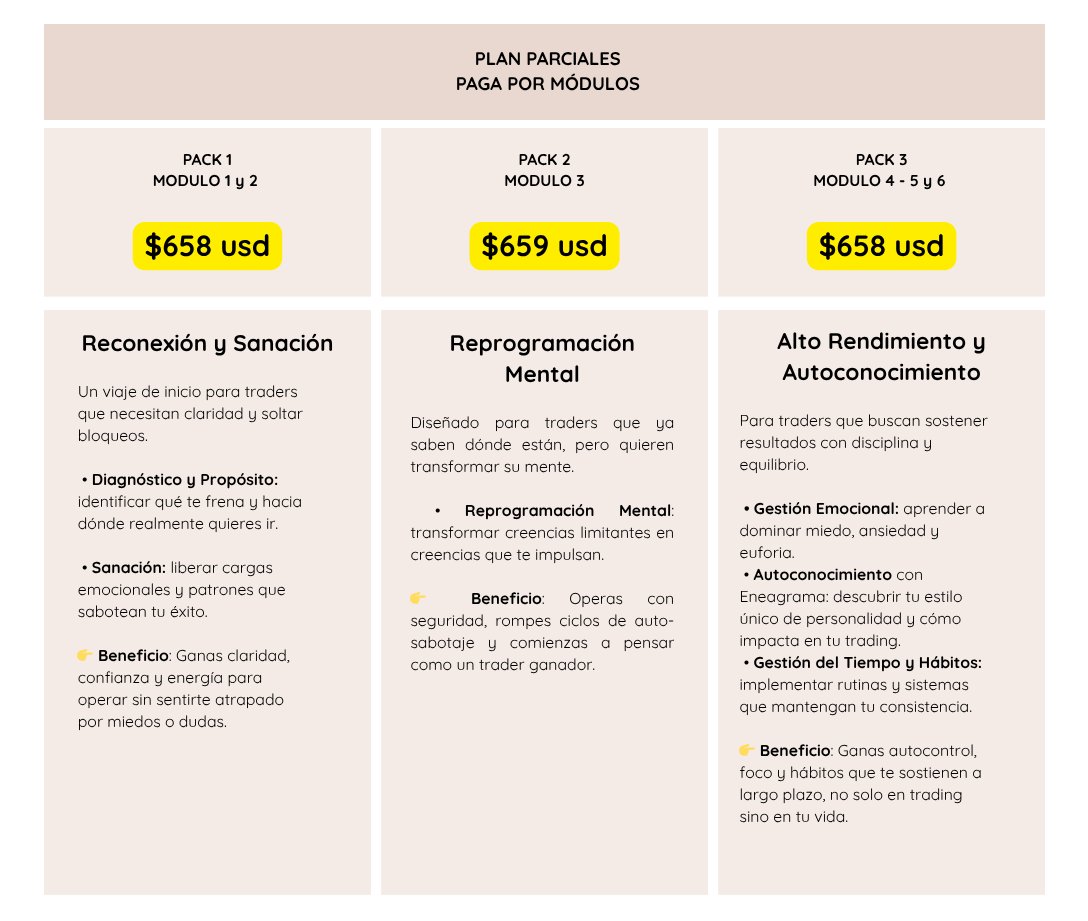 Es un entrenamiento integral que combina sanación, gestión emocional, reprogramación mental y mucho más para ayudarte a operar de manera consistente y sin bloqueos emocionales.